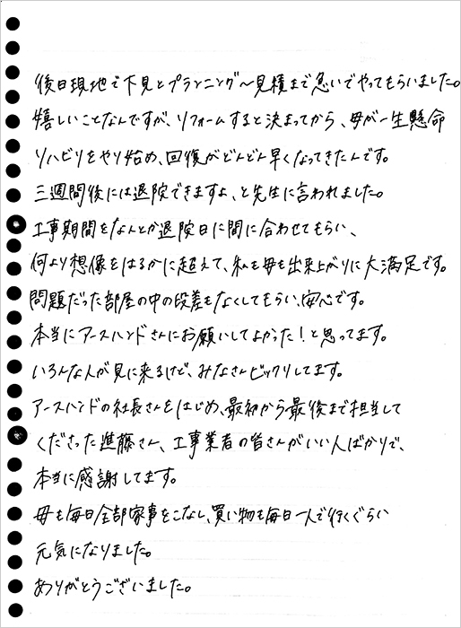 母親がリハビリ頑張れるように、リフォームをしたらどうかと、入院中の母親に持ち掛けると大乗り気で、やって欲しいと。